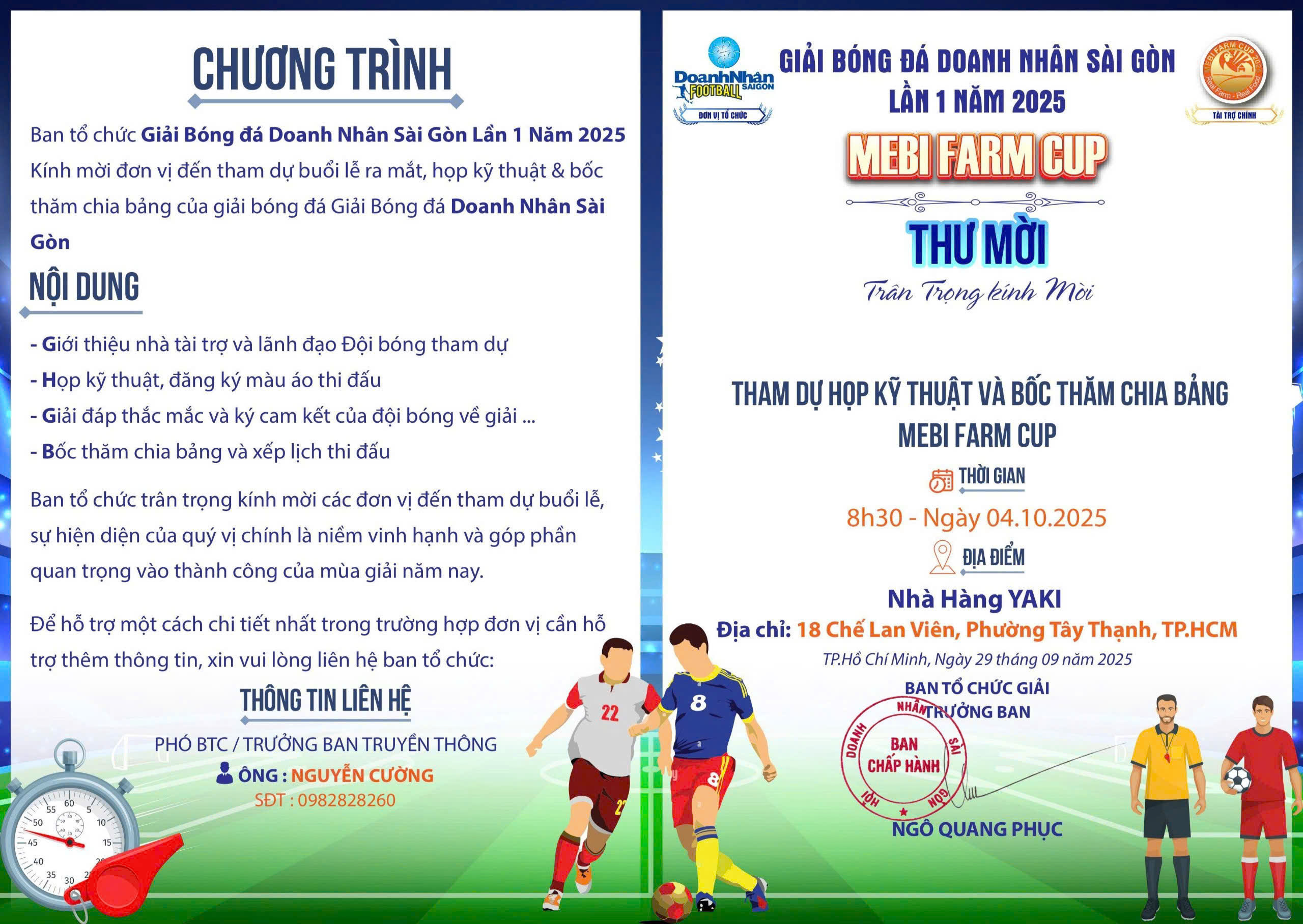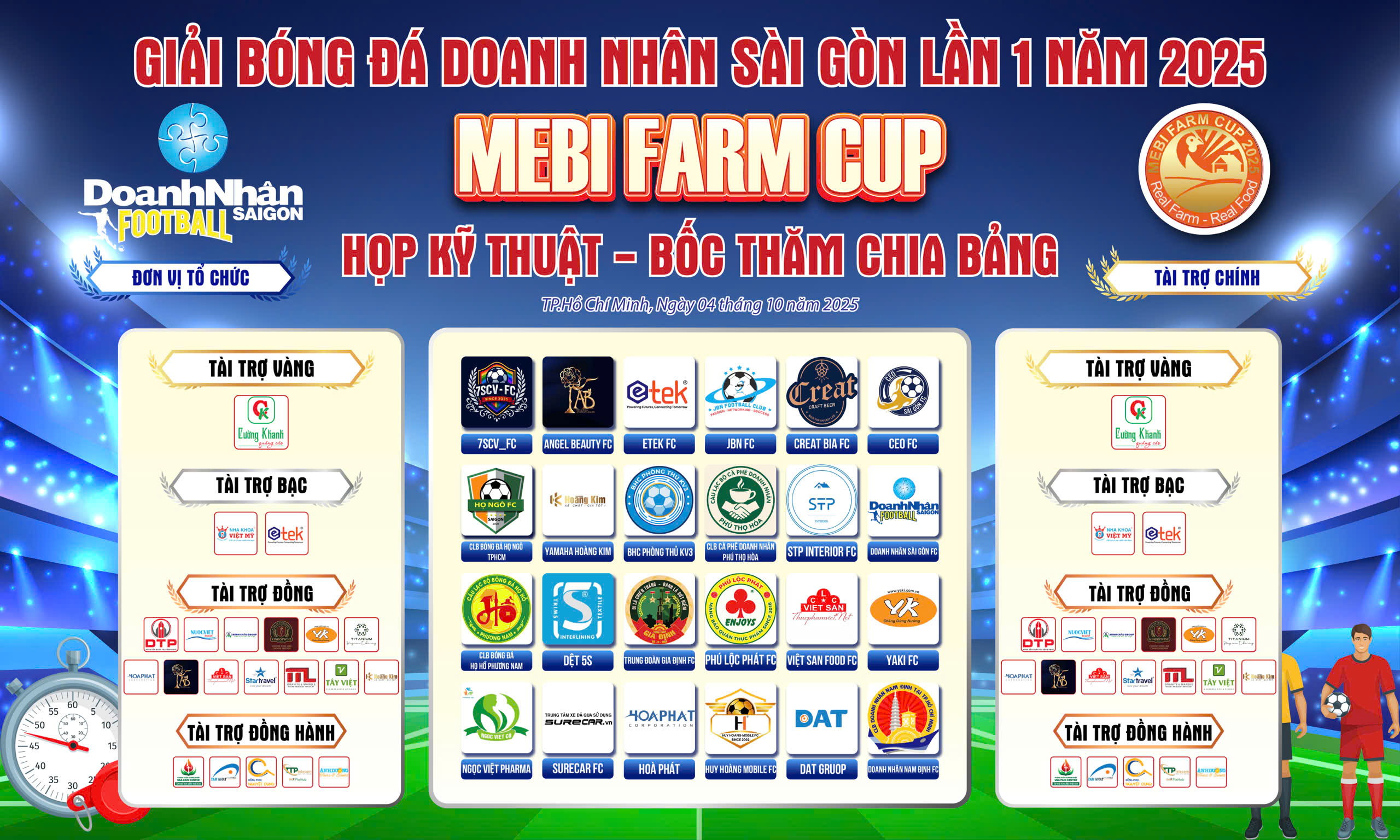 (ceotoancau.vn) Ban Tổ chức trân trọng thông báo: Giải bóng đá Doanh nhân Sài Gòn lần thứ 1 – Năm 2025, Tranh Cúp MEBI Farm chính thức khởi tranh từ ngày 11.10.2025 tại Cụm sân bóng đá PM SPORT – 104 Tân Sơn, phường Tân Sơn, TP.HCM.