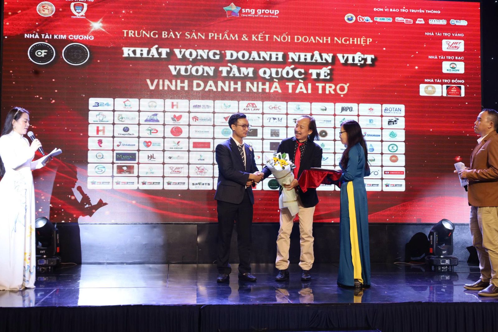 Ông Hoàng Liên Giang – ONFA Fintech USA đại diện Nhà tài trợ Kim Cương nhận bảng tri ân và hoa từ ông Lã Vọng Thanh - Đại diện Ban điều hành SNG Group tại thị trường Mỹ.
