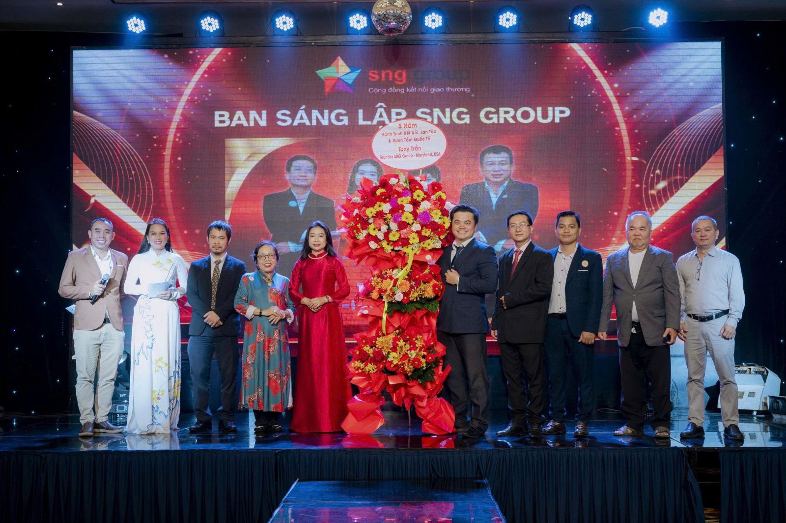 Ban điều hành SNG Group 2025 bên lãng hoa chúc mừng của ông Tony Trần - Nguyên Chủ tịch SNG Group 2022, Sáng lập SNG Group gửi từ Mỹ nhân kỷ niệm 5 năm hình thành và phát triển.