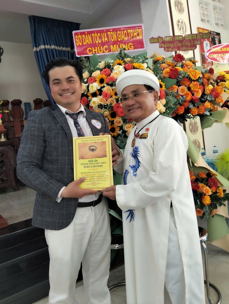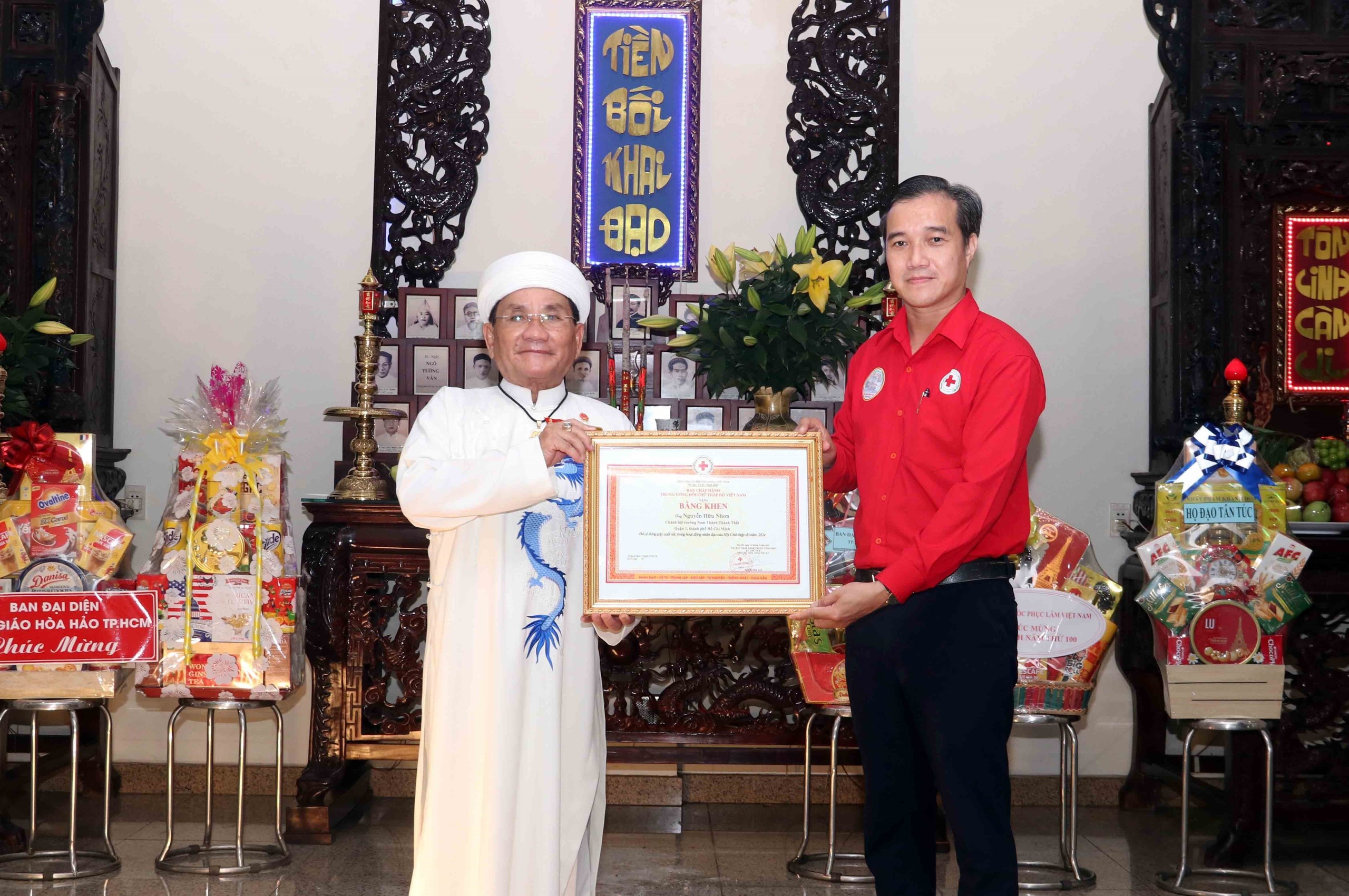 Đại diện Hội Chữ thập đỏ Thành phố Hồ Chí Minh trao tặng Bằng khen cho ông Nguyễn Hữu Nhơn (Chí Đạt), Chánh Hội trưởng Ban Cai quản Nam Thành Thánh, vì những hoạt động tích cực trong công tác an sinh xã hội, hỗ trợ người nghèo, người khuyết tật.